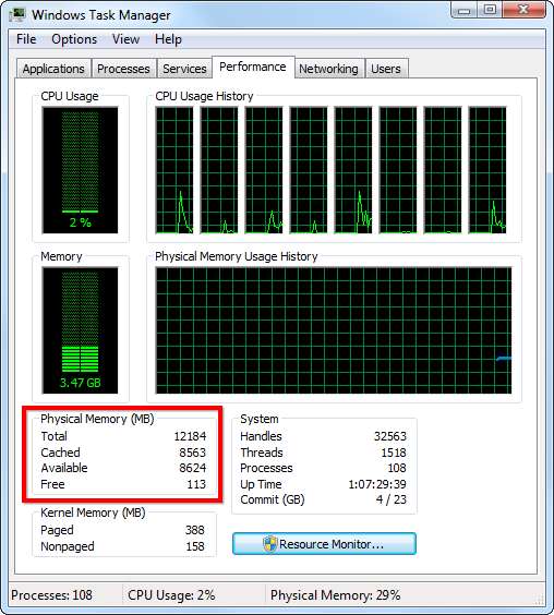 En el pasado, la RAM completa indicaba un problema. Si estaba ejecutando Windows Vista en una computadora con medio giga de RAM, podría sentir que la computadora se ralentizaba constantemente: tenía que leer y escribir constantemente en el disco duro, utilizando el disco duro archivo de página como un reemplazo ineficiente de la RAM. Sin embargo, las computadoras modernas generalmente tienen suficiente RAM para la mayoría de los usuarios. Incluso las computadoras de gama baja generalmente se envían con 4 GB de RAM, lo que debería ser más que suficiente, a menos que esté haciendo juegos intensivos, ejecutando múltiples máquinas virtuales o editando videos.