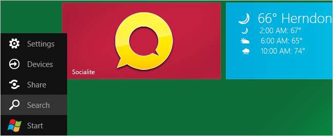 Al deslizar el dedo desde el lado derecho, se abrirá otro menú, al que llaman el menú "Accesos". Sí, ese es un nombre muy tonto. Esto le permite acceder a varias funciones como Buscar, Compartir o Configuración, y esto funciona en todos los ámbitos en las aplicaciones de Metro. Lo más probable es que utilice esta función con más frecuencia para buscar y compartir desde aplicaciones, por ejemplo, si estaba viendo una foto y quería compartirla en Facebook, o si necesitaba hacer una búsqueda a través de una aplicación para un archivo.