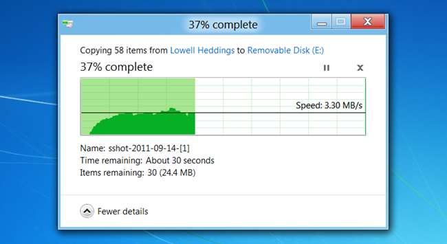 Uno de los cambios más agradables en Windows 8 son los nuevos cuadros de diálogo de copia de archivos, que fueron muy útiles durante una serie de trabajos de copia de archivos que estaba haciendo. La vista predeterminada le brinda mucha más información sobre la transferencia de archivos y parece ser mucho más precisa que todas las demás versiones de Windows.