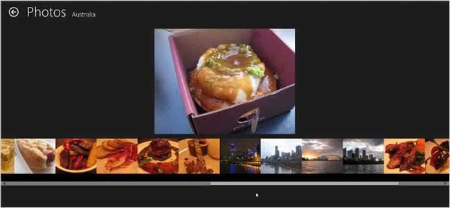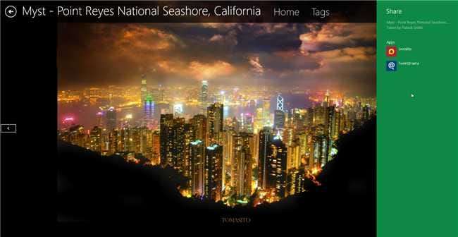 La versión de Windows 8 viene con un montón de aplicaciones de muestra que realmente muestran lo interesante que puede ser esta nueva interfaz. Por ejemplo, en la captura de pantalla anterior, estamos viendo la aplicación Picstream, que extrae imágenes interesantes de Flickr. Puede utilizar la tecla de acceso directo universal Win + Q para abrir el panel de búsqueda de esta aplicación, escribir cualquier cosa y encontrar algunas imágenes interesantes que la gente ha publicado en Flickr.