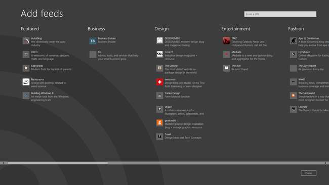 También hay una aplicación de lector de feeds, que es bastante fácil de usar. Seleccione sus feeds o agréguelos usando el cuadro de texto ...