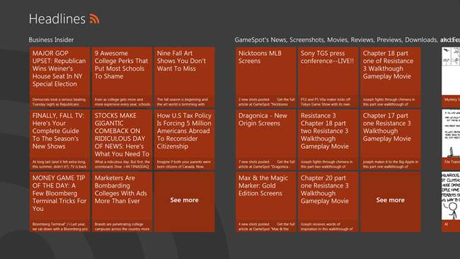 Metro es una interfaz basada en mosaicos que se enfoca en ser limpia y simple, con íconos simples y hermosa tipografía en lugar de las típicas sombras y las interfaces de botones en relieve a las que estamos acostumbrados. Muchos mosaicos son más que un iniciador de aplicaciones, contienen datos en vivo que se actualizan automáticamente: un mosaico del clima mostrará automáticamente el informe meteorológico más reciente, un título de noticias mostrará lo último de sus feeds, el widget social mostrará las últimas fotos de Facebook , y su indicador de cotizaciones le mostrará automáticamente lo que están haciendo esos codiciosos de Wall Street.