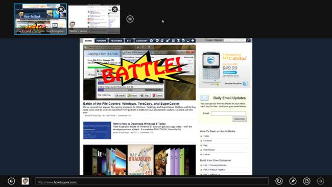 Inicie Internet Explorer desde la pantalla Metro y accederá a un modo de navegador de pantalla completa que no se parece a nada al que está acostumbrado. Si usa el atajo de teclado Win + Z para que aparezca la barra de aplicaciones, verá cada pestaña y la barra de direcciones en la parte inferior.