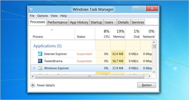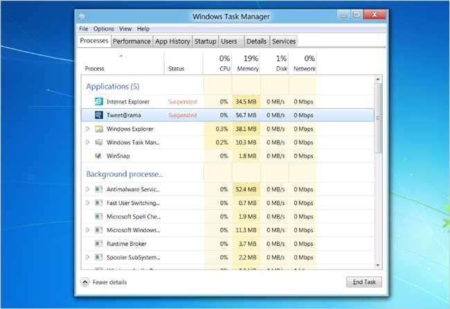 Lo primero que puede notar en esta captura de pantalla es que dos de los procesos tienen un estado de "Suspendido". Esto se debe a que ambos se ejecutan como aplicaciones Metro y, dado que se ejecutan en segundo plano, están suspendidos y no consumirán tiempo de procesador.