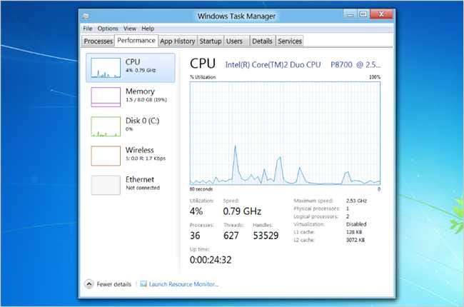 Pase a la pestaña Rendimiento y verá un cuadro de diálogo extremadamente elegante que le permite controlar todo el uso de la CPU, la RAM, el disco y la red. Increíble.