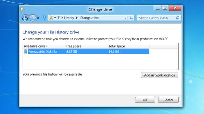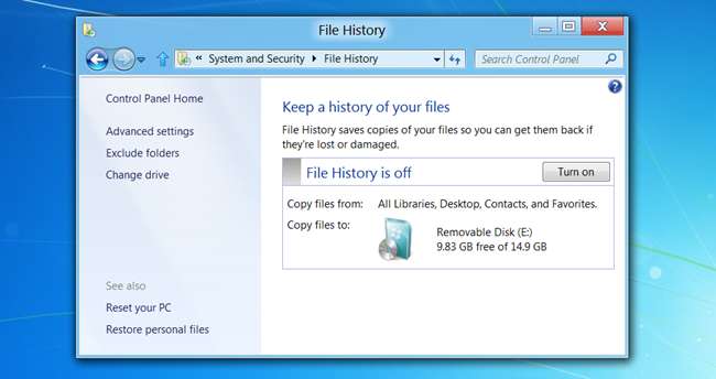 Mmm, espera ... ¿qué es eso del historial de archivos? Efectivamente, si mira a través del Panel de control, verá un nuevo panel de Historial de archivos, donde puede configurar una unidad de respaldo para almacenar un historial de todos sus archivos de usuario. Es una solución de respaldo.