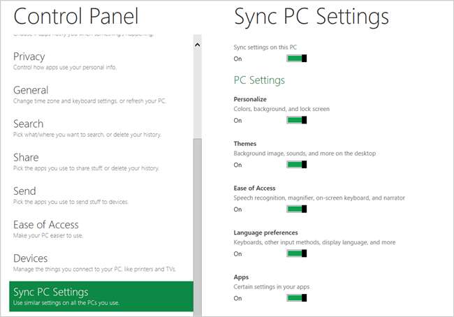 Si hace clic en el icono del Panel de control en la pantalla de Metro, verá un nuevo cuadro de diálogo de pantalla completa con un montón de opciones. La mayoría de ellos se explican por sí mismos, por lo que no vamos a entrar en detalles aquí. Puede usar Personalizar para cambiar fácilmente la imagen de la pantalla de bloqueo y cambiar las aplicaciones que muestran notificaciones en la pantalla de bloqueo, aunque actualmente no hay aplicaciones disponibles para usar.