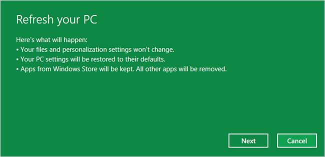La opción Actualizar es como hacer una recarga de Windows sin deshacerse de su carpeta de usuario: las aplicaciones de la tienda de Windows se mantendrán, las aplicaciones de estilo Windows 7 se eliminarán.
