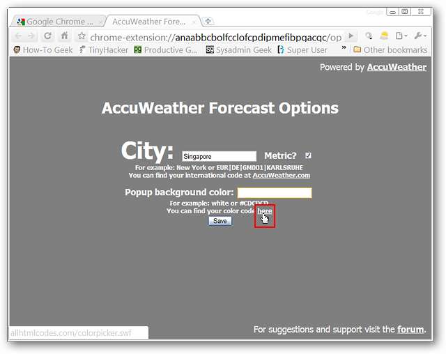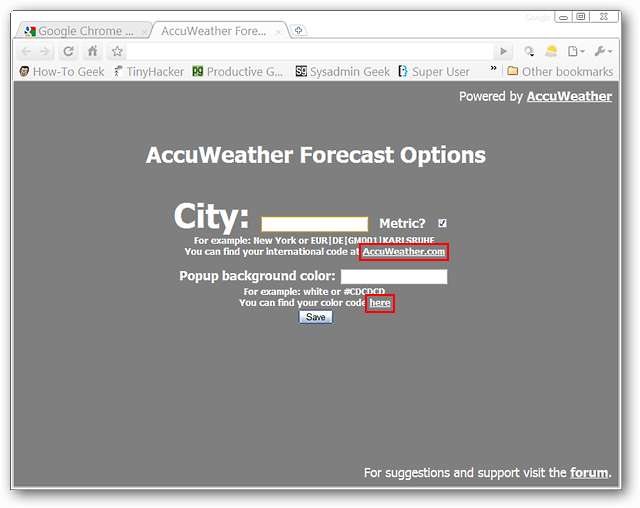 Možnosti se otevřou na nové kartě, kde můžete přidat název města, pro které chcete předpovědi počasí, rozhodnout, zda použít metrická měření, či nikoli, pomocí dostupného odkazu vyhledat kód pro mezinárodní umístění a nastavit barvu pozadí pro rozevírací okno počasí.