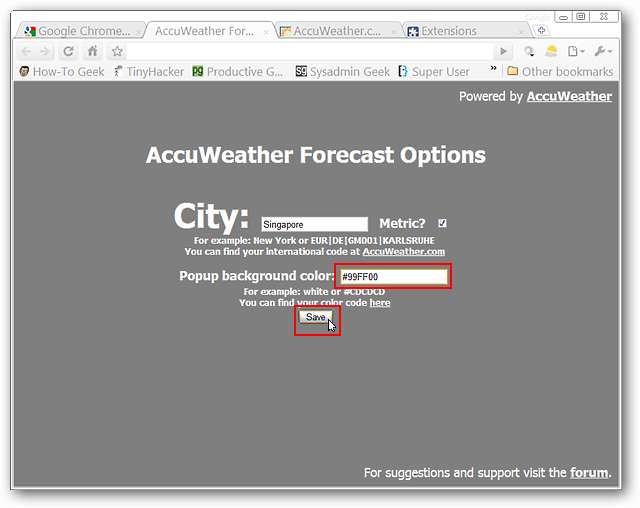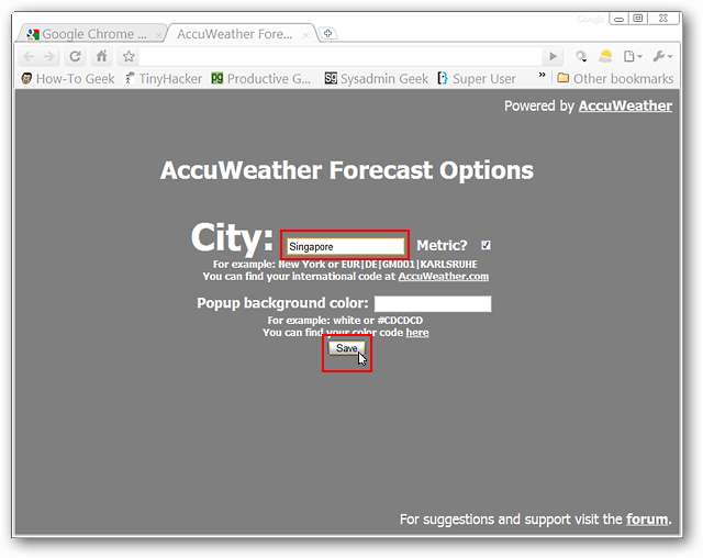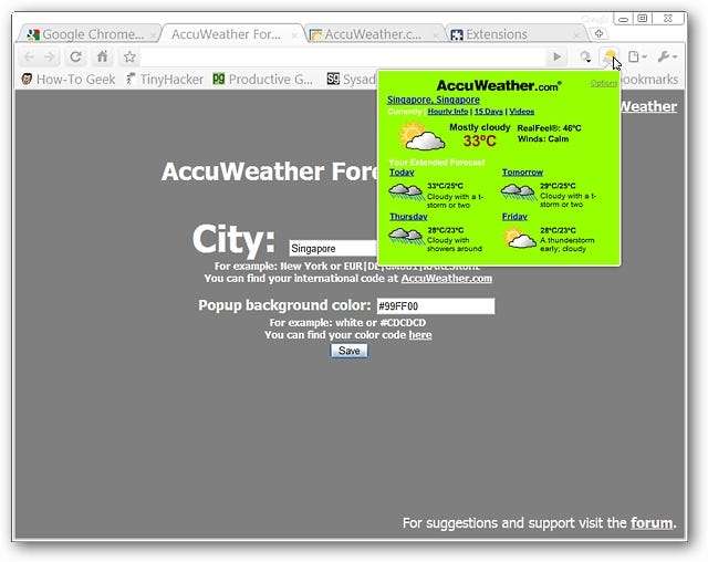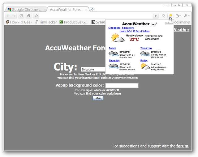 Dokázali jsme psát v Singapuru a získat požadované předpovědi počasí, aniž bychom museli hledat kód na stránce „accuweather.com“. Jakmile přidáte své umístění, klikněte na „Uložit tlačítko“ pro dokončení (pokud nechcete provádět žádné změny barvy pozadí pro rozevírací okno počasí).