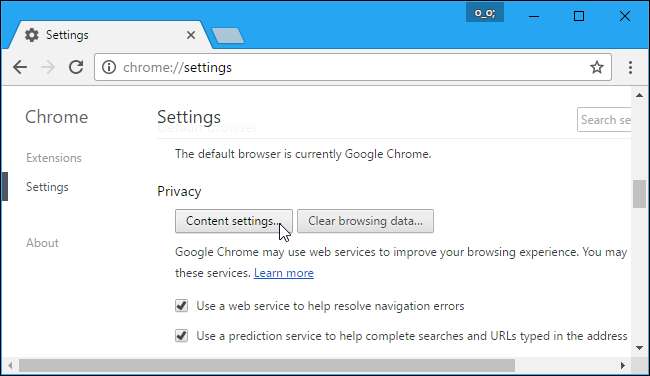 Tato funkce je k dispozici v nastavení soukromí prohlížeče Chrome. Klikněte na nabídku Chromu a přejděte do Nastavení. Klikněte na odkaz „Zobrazit pokročilá nastavení“ v dolní části stránky Nastavení prohlížeče Chrome a poté klikněte na tlačítko „Nastavení obsahu“ v části Ochrana osobních údajů.