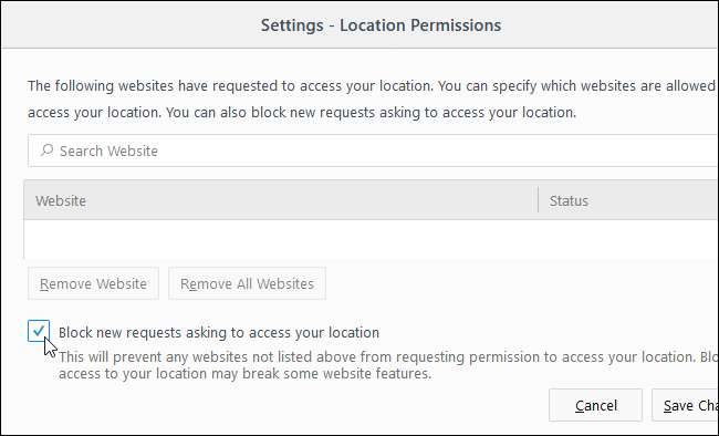 Chcete-li přestat zobrazovat žádosti o umístění z nových webů, zaškrtněte políčko „Blokovat nové žádosti o přístup k vaší poloze“ a klikněte na „Uložit změny“. Všechny weby, které jsou aktuálně v seznamu a jsou nastaveny na „Povolit“, budou nadále vidět vaši polohu.