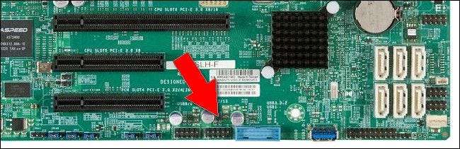 Pojďme znovu odkazovat na stejnou fotografii. Mírně nalevo od USB portu na fotografii jsou tři USB hlavičky (dvě černé USB 2.0 hlavičky a jedna USB 3.0 hlavička); banka tří je označena šipkou na fotografii níže. Zatímco interní USB porty jsou na základních deskách spotřebitelů vzácné, tyto záhlaví (zejména ty USB 2.0) se nacházejí téměř na každé základní desce kolem.