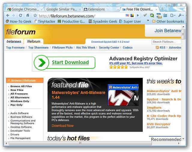 Pro náš test jsme vybrali tři různé typy webů. První byl pro „fileforum“, web pro stahování softwaru.