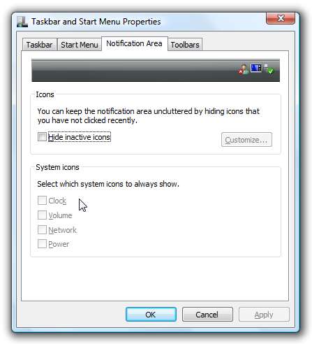 Za normálních okolností můžete položky znovu povolit kliknutím pravým tlačítkem na hlavní panel, výběrem vlastností a přechodem na kartu Oblast oznámení: