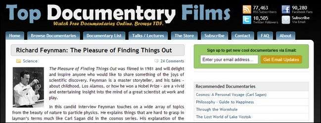 Weby pro sdílení videí a internet obecně byly pro dokumenty skutečným přínosem, ale mnohokrát (zejména u YouTube) jsou všude rozesety a špatně označeny a popsány. našel jsem Nejlepší dokumentární filmy před několika měsíci a opravdu se mi to líbilo ... stránky katalogizují videa se skvělými popisy a užitečnými tagy, takže ve skutečnosti najdete všechny skvělé bezplatné dokumenty. Stejně jako například tento týden uvádějí Potěšení z hledání věcí , klasika Richarda Feynmana.