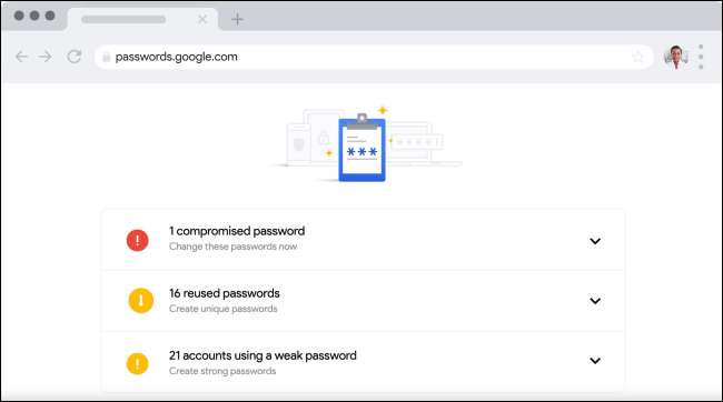 Správce hesel Google se také zlepšuje. Kontrola hesla přichází do správce hesel Google na webu. Stejně jako podobné funkce ve správcích hesel, jako jsou LastPass a 1Password, bude vás zajímat, která hesla jsou slabá, která jste opakovaně použili na více webech a u kterých bylo zjištěno, že byla narušena při narušení dat. Pak víte, která hesla byste měli zvážit.