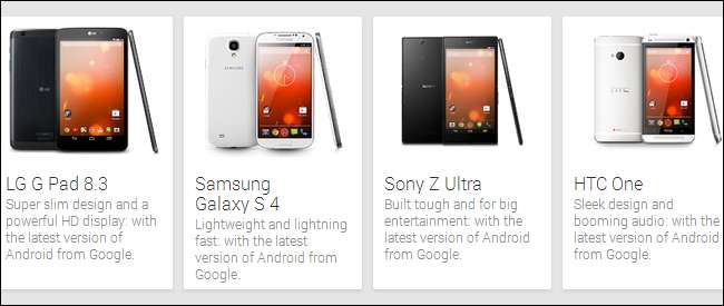 Google nyní prodává zařízení „Google Play Edition“ spolu se svými zařízeními Nexus na internetu Google Play obchod webová stránka. Tato zařízení jsou verzemi populárních telefonů a tabletů se systémem Android, na nichž běží jiný software. Zdá se, že jsou primárně určeny pro nadšence a vývojáře systému Android.