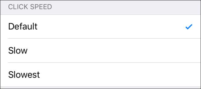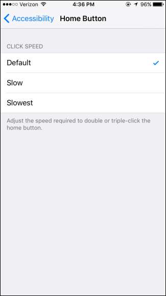 Pro rychlost kliknutí na tlačítko Domů máte tři možnosti: Výchozí, Pomalé a Nejpomalejší. Pomalejší rychlosti umožňují více času mezi kliknutími, když dvakrát nebo třikrát kliknete na tlačítko Domů. Když provedete výběr, vaše zařízení třikrát zavibruje, aby vám ukázalo rychlost potřebnou pro několik kliknutí. Vyberte ten, který vám nejlépe vyhovuje, a ukončete aplikaci Nastavení.