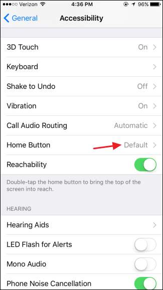 Na stránce Usnadnění přejděte dolů v dolní části seznamu nastavení a klepněte na „Tlačítko Domů“.
