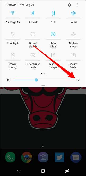 Nejprve dvakrát stáhněte stín oznámení, čímž se zobrazí panel Rychlá nastavení a lišta jasu. Vidíte tu malou šipku na konci pruhu jasu? Poklepejte na to.