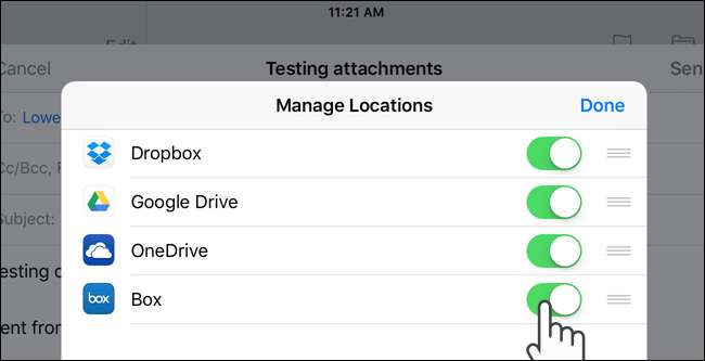 V dialogovém okně „Správa míst“ můžete v seznamu „Místa“ vypnout všechny poskytovatele úložiště, které nechcete zobrazovat. Jednoduše klepněte na zelené posuvné tlačítko u každého poskytovatele, kterého chcete skrýt. Po dokončení klepněte na „Hotovo“.