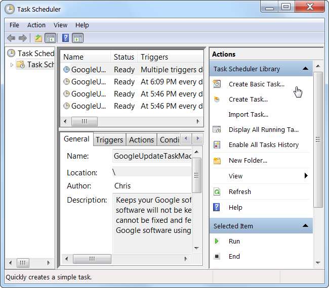 Klikněte na odkaz Vytvořit základní úlohu na pravé straně okna Plánovač úloh. Tento odkaz otevře snadno použitelného průvodce, který vás provede procesem vytváření úkolu. Pokud chcete pokročilejší možnosti, klikněte místo toho na Vytvořit úlohu.