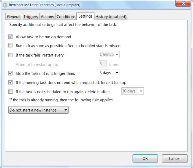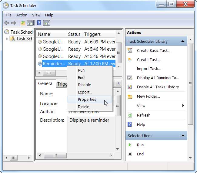 Chcete-li upravit pokročilejší možnosti úkolu, klikněte pravým tlačítkem na úkol, který jste již vytvořili, a vyberte Vlastnosti. Můžete také kliknout na odkaz Vytvořit úkol v postranním panelu a vytvořit nový úkol v pokročilém rozhraní, přeskočením průvodce.
