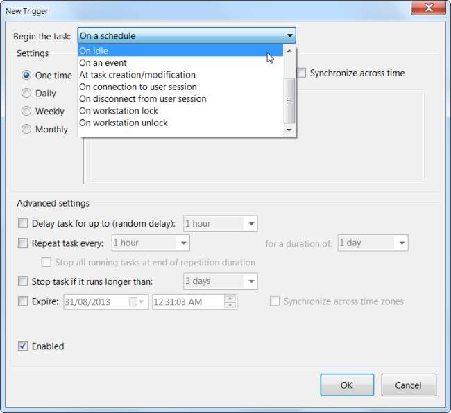 Můžete například nastavit jiné typy spouštěčů - můžete spustit příkaz, když se počítač uzamkne nebo odemkne, nebo když se počítač nečiní - to je ideální pro úlohy údržby, které by se neměly spouštět, když někdo počítač používá.