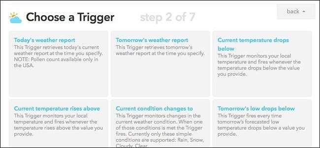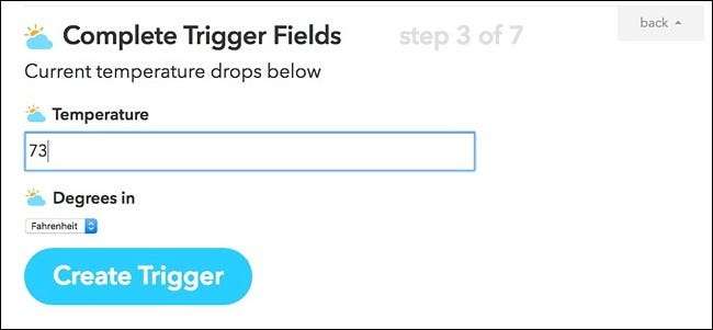 Po připojení kanálu Počasí a přístupu na stránku „Vytvořit spouštěč“ vyberte z možností „Aktuální pokles teploty pod“.