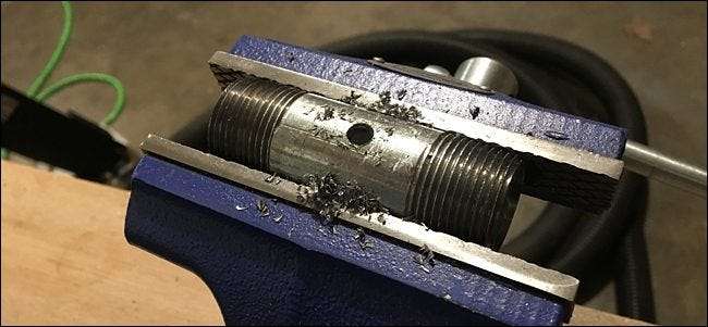 Dále vezměte vrták určený pro vrtání do kovu a jděte do města, přičemž vyvíjejte velký tlak, ale jděte pomalu. Pokud to uděláte správně, měli byste skončit s čistými otvory na obou stranách potrubí.