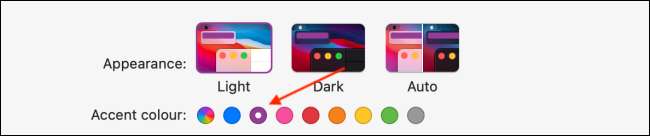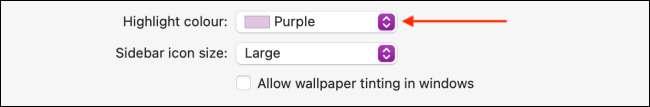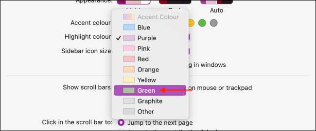 Po vyberte barvu akcentu, MACOS automaticky z něj činí výchozí hodnotu zvýraznění. Pokud byste raději použili jinou barvu zvýraznění, stačí kliknout na rozevírací šipku vedle "Zvýraznit barvu".