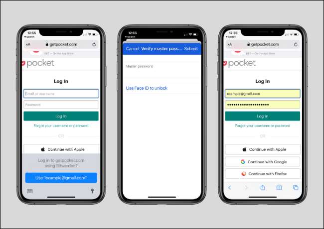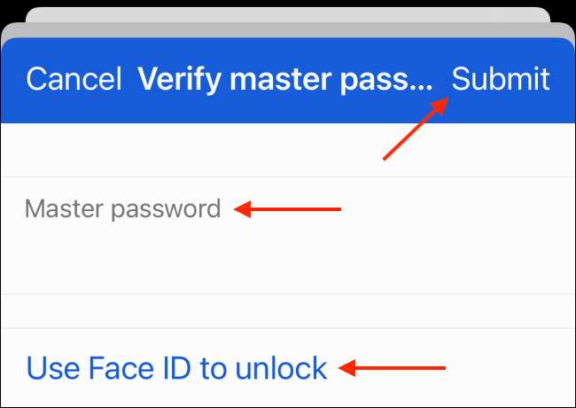 Služba, kterou vyberete, bude třeba ověřit. V našem příkladu, Bitwarden. Bude vyžadovat přihlášení k účtu pomocí hlavního hesla (nebo autentizace pomocí ID obličeje nebo ID ID). Klepněte na tlačítko "Odeslat" pro ověření.