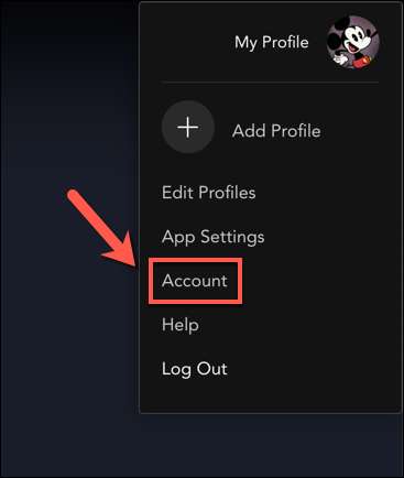Chcete-li začít, přihlaste se Disney + webová stránka Ve vašem prohlížeči volby pak přejděte na možnost "Můj profil" v pravém horním rohu. V rozevírací nabídce vyberte možnost "Účet".