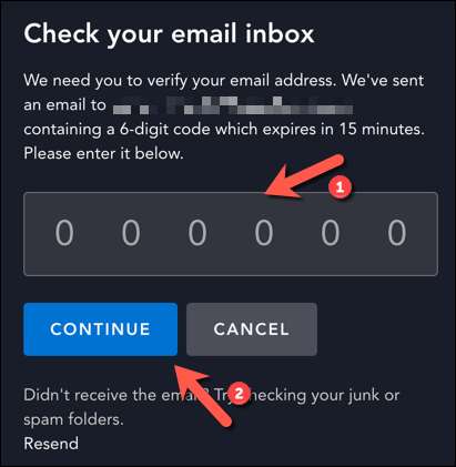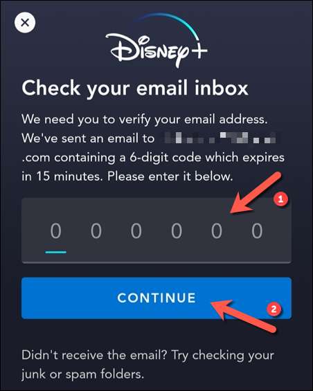 Jako bezpečnostní opatření, Disney + vás požádá o zadání šestimístného kódu odeslaného na vaši existující e-mailovou adresu. Zkontrolujte schránku pro kód, zadejte jej do pole dodané před výběrem "Pokračovat" pokračovat.