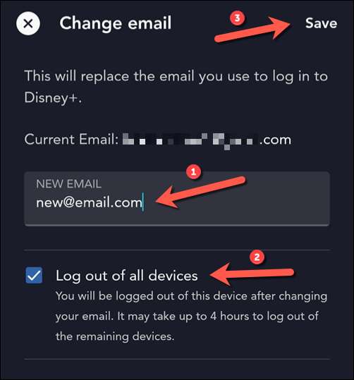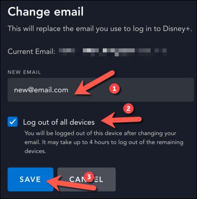 V nabídce "Změnit e-mail" zadejte svou novou e-mailovou adresu před klepnutím na možnost "Uložit". Chcete-li se podepsat z jiných zařízení jako bezpečnostní opatření, nezapomeňte zaškrtněte políčko "Odhlášení ze všech zařízení".