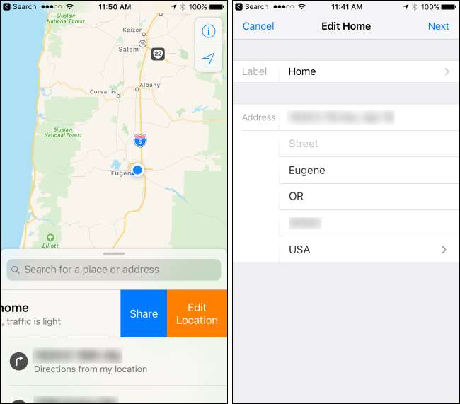 Tyto informace můžete také změnit v samotných aplikacích Apple Maps, přestože nenajdete obrazovku nastavení, která vám je umožní změnit. Chcete-li tak učinit, vyhledejte pod vyhledávacím polem místa svou domovskou adresu. Přejeďte po své domovské adrese doleva a klepněte na „Upravit místo“.