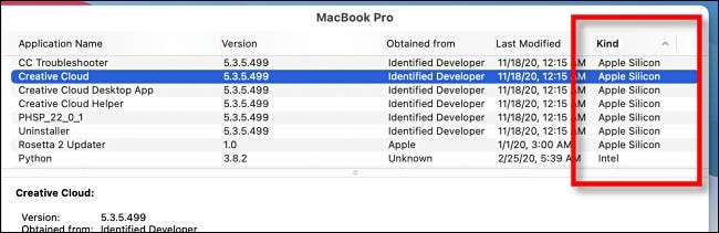 Můžete dokonce dokonce kliknout na záhlaví sloupce "druhu" a třídit všechny vaše aplikace podle podpory architektury tak, aby všechny funkce "Apple Silicon" budou uvedeny dohromady.