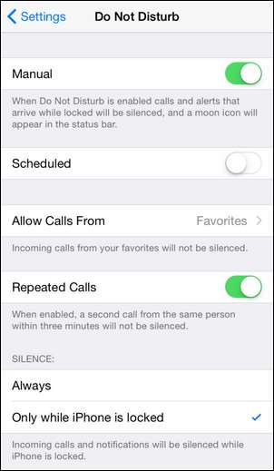 První možnost „Ruční“ je na první pohled trochu matoucí. Jedná se o ruční vypínač pro funkci Nerušit, nikoli o přepínání skutečných nastavení. Funguje přesně stejně, i když mnohem méně pohodlně, protože přepínač Nerušit nalezený v Ovládacím centru iOS jsme zvýraznili v předchozí části tohoto článku. Na manuálním režimu se nic nemění, pouze se zapíná a vypíná režim Nerušit.