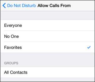Pokud vyberete možnost „Povolit hovory od“, můžete upravit, jak Nerušit zpracovává příchozí telefonní hovory. Ve výchozím nastavení zapnou vyzvánění pouze lidé ve vašem seznamu kontaktů „Oblíbené“ (který je prázdný, dokud jej nenaplníte označením položek kontaktu jako „Oblíbené“), když je telefon v režimu Nerušit. Toto nastavení můžete změnit na všechny, na nikoho, nebo můžete určit skupinu ze seznamu kontaktů jako seznam povolených volajících.