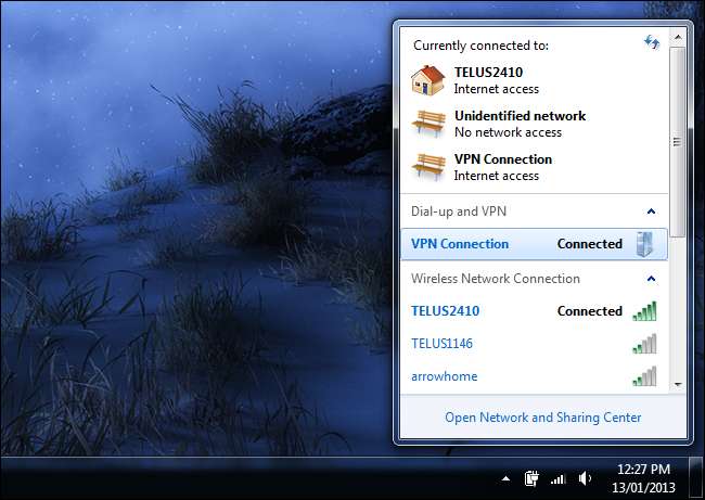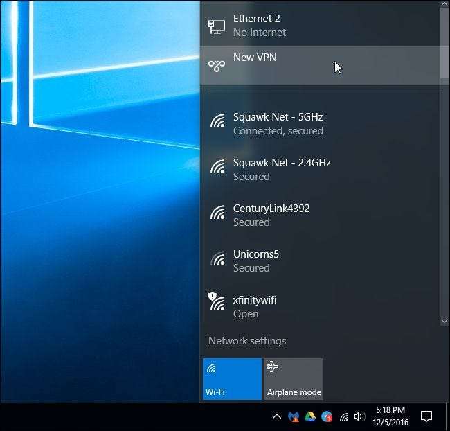 Jakmile nastavíte VPN, uvidíte ji v rozbalovací nabídce sítě vedle všech blízkých sítí Wi-Fi.