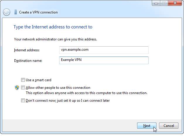 Chcete-li se připojit k síti VPN v systému Windows 7, stiskněte klávesu Windows a, zadejte VPN a stiskněte klávesu Enter. (Poznámka: Pokud používáte Windows 8, proces bude velmi podobný, ale některá okna mohou vypadat trochu jinak.)