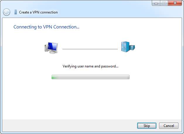Windows vás připojí k VPN, kterou jste nakonfigurovali. Pokud jste na první obrazovce zaškrtli políčko „Nepřipojovat nyní“, systém Windows uloží připojení VPN, abyste se mohli snadno připojit později.