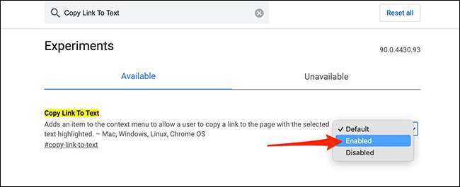 Ve výsledcích vyhledávání klepněte na rozevírací nabídku vedle "Kopírovat odkaz na text" a vyberte možnost "Enabled".