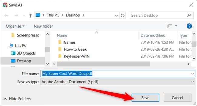 Otevře se okno s výzvou k výběru, kam uložit Soubor PDF —V tuto chvíli můžete dokonce změnit název souboru, pokud chcete. Přejděte do složky, kterou chcete uložit, a poté klikněte na tlačítko „Uložit“.