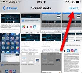 Chcete-li přidat soubory do nového balíčku, otevřete aplikaci Fotografie a otevřete album obsahující fotografie, které chcete přidat. Poté klepněte na „Vybrat“ v horní části obrazovky.