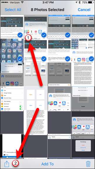 Poté klepněte na fotografie, které chcete přidat do balíčku, a klepněte na tlačítko „Sdílet“ v levém dolním rohu obrazovky.