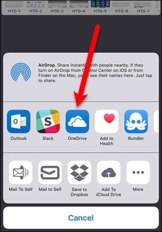 Na listu sdílení klepněte na „OneDrive“ (nebo vámi vybraný způsob sdílení).