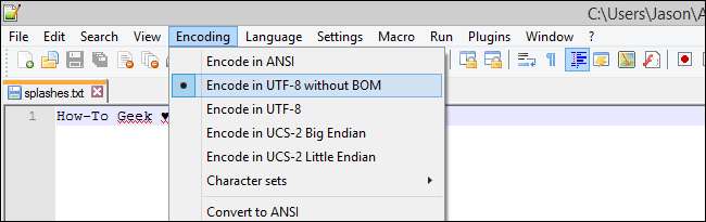 Trochu drobností stranou, je velmi jednoduché to obejít a udržet svůj úvodní text pěkný. Vše, co musíte udělat, je použít textový editor, který vám umožní nastavit kódování na „UTF-8 bez kusovníku“. Zde je snímek obrazovky toho, jak to vypadá v populárním textovém editoru Poznámkový blok ++.