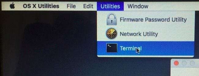 Na spustit do režimu obnovení , restartujte Mac a při spouštění podržte Command + R. Vstupíte do prostředí pro obnovení. Klikněte na nabídku „Nástroje“ a vyberte „Terminál“. Otevře se okno terminálu.